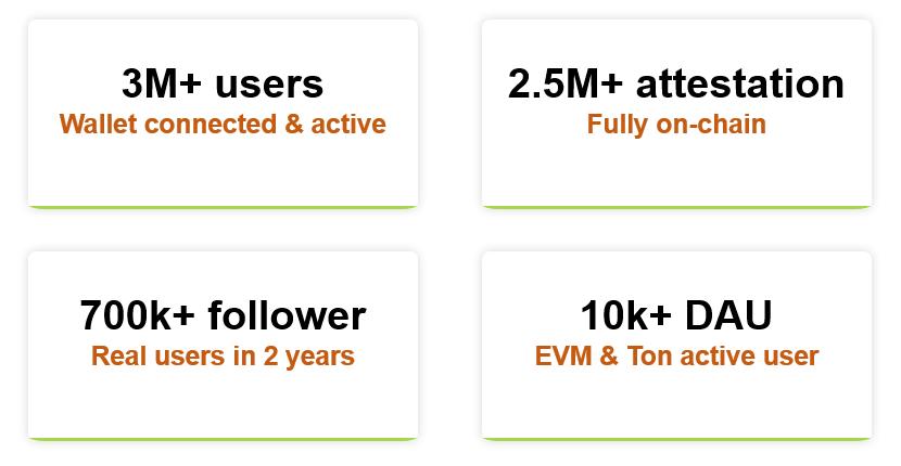 Trusta.AI has issued over 2.5 million on-chain attestations claimed by more than 1.5 million users, making it the top provider on both Linea and BSC, and ranking third on Scroll and second on TON Chain. In total, there are over 3 million users, which includes 1.8 million wallet addresses, 700,000 web accounts, and 500,000 Telegram users. Additionally, the monthly active user count ranges between 300,000 and 500,000. Trusta.AI also has over 700,000 followers on Twitter.